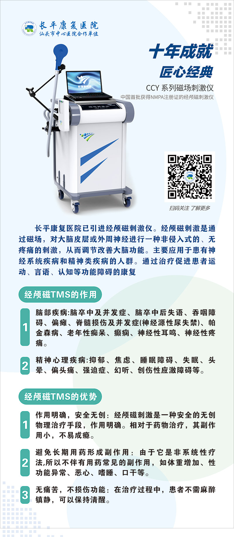 经颅磁刺激是通过磁场,对大脑皮层或外周神经进行一种非侵入式的、无疼痛的刺激,从而调节改善大脑功能。主要应用于患有神经系统疾病和精神类疾病的人群。通过治疗促进患者运动、言语、认知等功能障碍的康复。